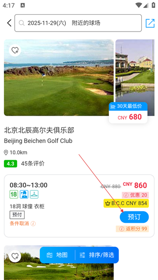 3、在球場列表中,選擇目標(biāo)球場(如【北京北辰高爾夫俱樂部】),點(diǎn)擊【預(yù)訂】。
