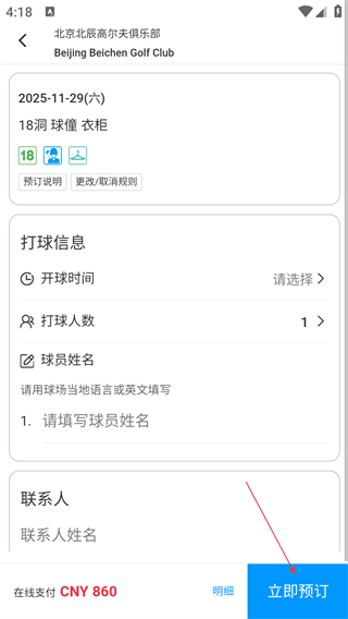 4、在預(yù)訂頁填寫打球信息與聯(lián)系人,點(diǎn)擊【立即預(yù)訂】完成操作。