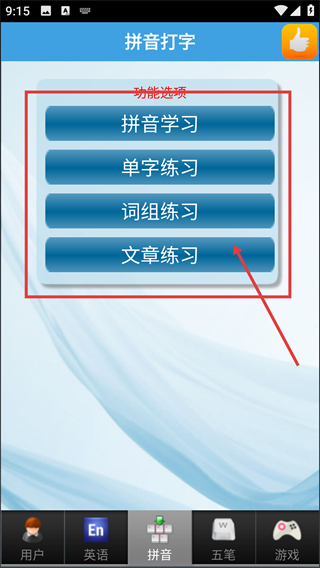 1、操作界面功能分類清晰,點(diǎn)擊對(duì)應(yīng)按鍵即可進(jìn)入英語、拼音、五筆等練習(xí)界面,新手也能快速找到所需的練習(xí)模塊。