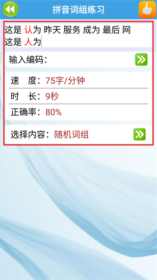 4、在拼音詞組練習(xí)頁可查看打字?jǐn)?shù)據(jù)(比如75-字/分鐘的速度),還能切換練習(xí)內(nèi)容哦。