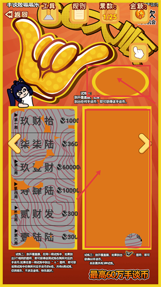 2、玩法包含多局試煉,【試煉一】規(guī)則為刮開覆蓋膜,刮出硬幣即可獲得對應手談幣,需按規(guī)則操作。