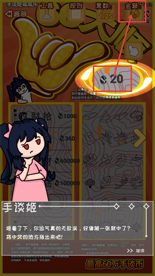 4、刮出【20】手談幣后,獎勵會累計到上方【金額】統(tǒng)計項中,可繼續(xù)參與試煉積累更多獎勵。