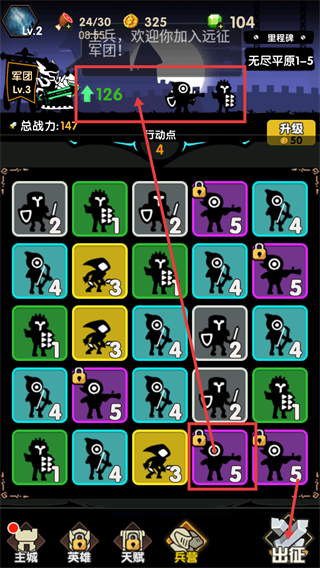 1、在【無盡平原1-5】界面,可選擇士兵組合提升【總戰力】,點擊【出征】按鈕開啟關卡挑戰。