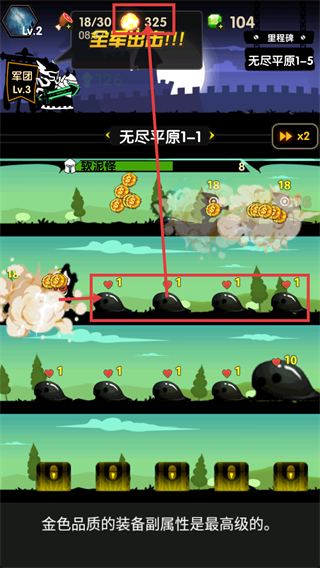2、挑戰【無盡平原1-1】時,擊敗【軟泥怪】可獲取金幣,注意優先攻擊血量為1的小怪提升效率。