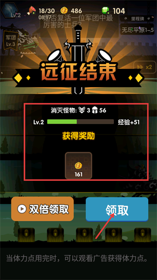 4、【遠征結束】后,領取【經驗+51】與金幣獎勵,體力耗盡時可看廣告補充以繼續挑戰。