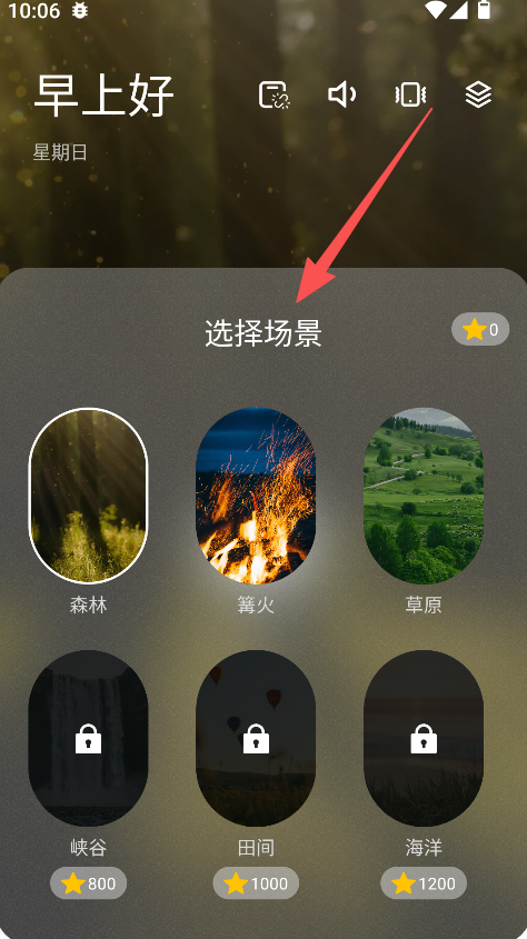 1、實現冥想場景選擇功能,含森林篝火草原等類別,部分場景需對應星星數量解鎖,選定對應場景開展冥想練習。