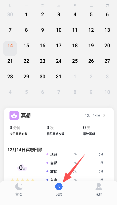 3、支持冥想記錄查看功能,展示今日時長累計次數及冥想回顧,呈現冥想相關的數據狀態。