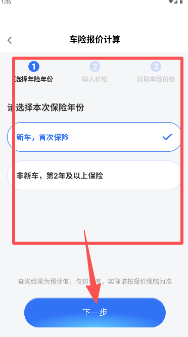 2、進入計算界面并按步驟選擇保險年份與輸入車輛價格。