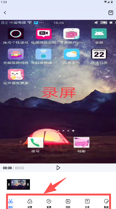 3、在視頻編輯界面,通過下方工具欄選擇“剪輯”等功能,對視頻進行裁剪、調速等處理完成。