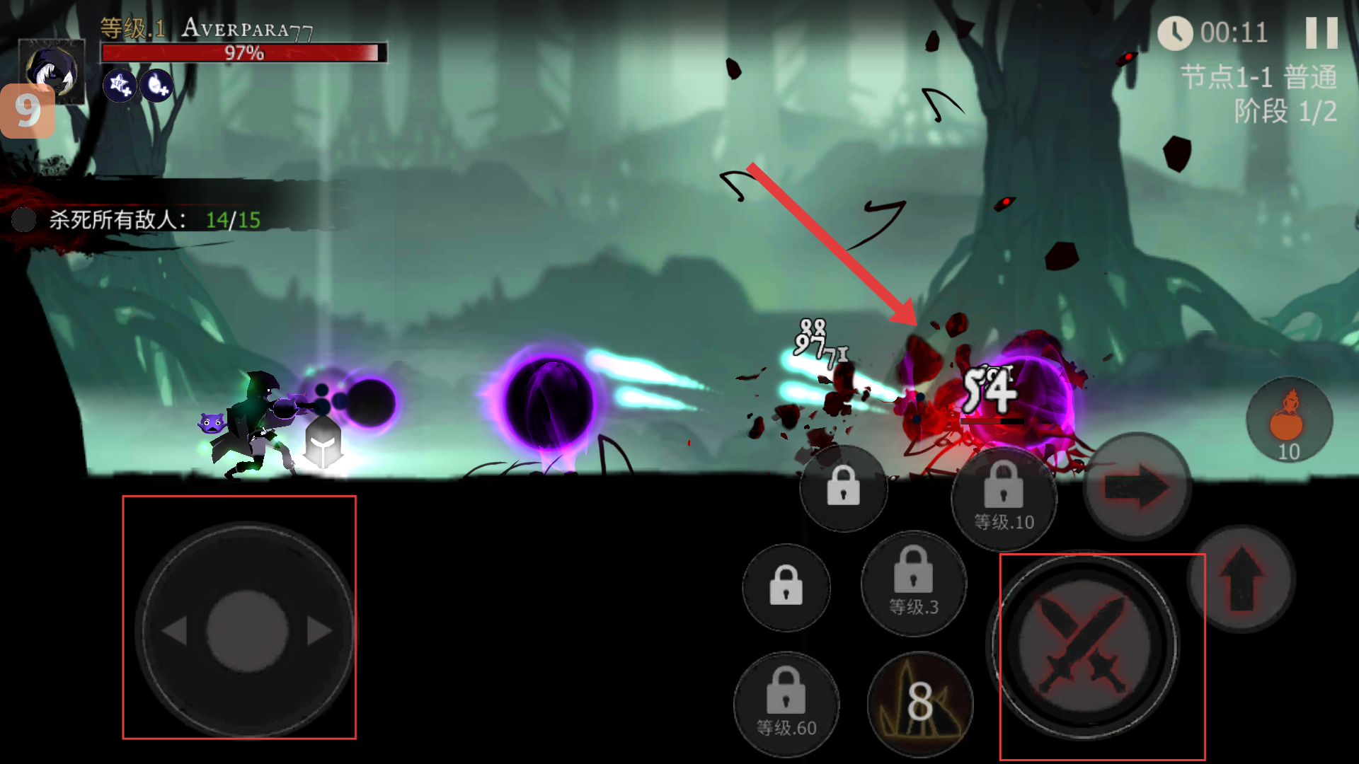 1、左手操控【移動】按鈕調整位置,右手點擊【攻擊】按鈕擊殺敵人,完成【節點1-1】【普通】【階段1/2】的擊殺目標。