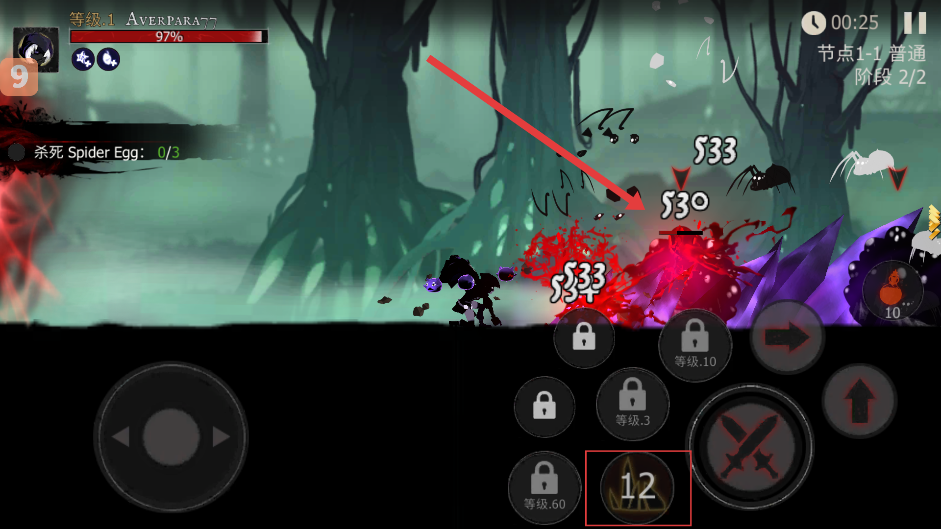 2、面對【SpiderEgg】時,利用【攻擊】與【技能】配合輸出,快速完成【節點1-1】【階段2/2】的擊殺任務。