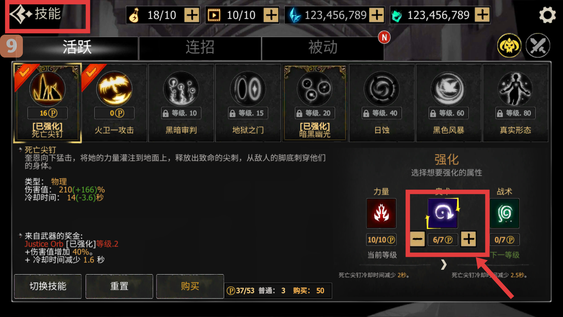 4、強化【死亡尖釘】技能時,優先選擇【奧秘】屬性,減少冷卻時間,提升戰斗中的技能釋放頻率。
