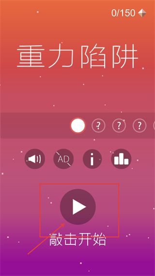 1、進入【重力陷阱】界面,留意右上角【0/150】的資源,找到【AD】功能按鈕,按紅色框提示【敲擊開始】啟動游戲。