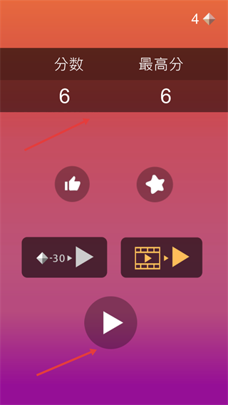 4、結算界面查看【分數-6】與【最高分-6】,可選擇消耗【30-鉆石】或點擊重新開始按鈕,再次挑戰游戲。