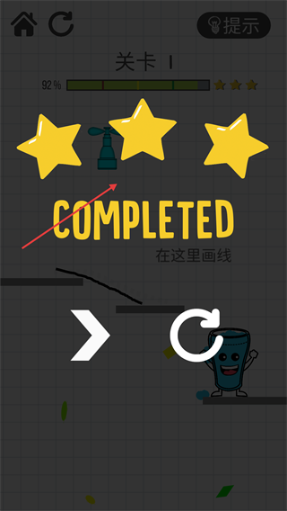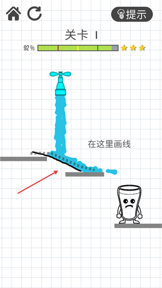 3、在【關(guān)卡1】中,按提示在【在這里畫(huà)線】區(qū)域繪路徑,引導(dǎo)水龍頭水流通向杯子,可借助【提示】按鈕獲取助力。