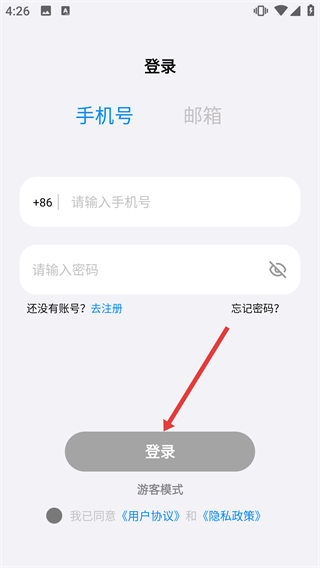 1、在登錄頁(yè),可選【手機(jī)號(hào)】輸入框填號(hào)+【密碼】框填密碼,勾選【我已同意《用戶協(xié)議》和《隱私政策》】后點(diǎn)登錄。