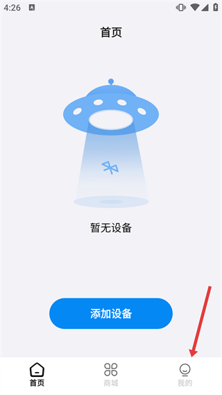 2、進(jìn)入首頁(yè)看到【暫無(wú)設(shè)備】提示,可點(diǎn)擊【添加設(shè)備】按鈕關(guān)聯(lián)設(shè)備,底部點(diǎn)擊【我的】進(jìn)入個(gè)人中心頁(yè)面。