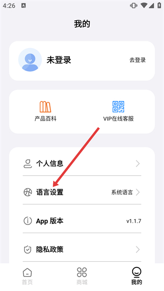 3、在【我的】頁(yè)面,找到【語(yǔ)言設(shè)置】選項(xiàng),當(dāng)前顯示【系統(tǒng)語(yǔ)言】,點(diǎn)擊該選項(xiàng)可進(jìn)入語(yǔ)言選擇界面。
