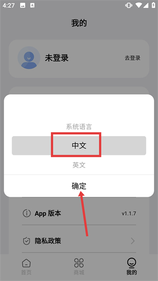 4、在語(yǔ)言選擇彈窗中,選擇【中文】選項(xiàng)后,點(diǎn)擊【確定】按鈕,即可完成軟件語(yǔ)言的設(shè)置操作。