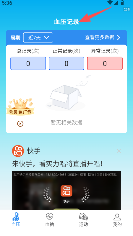 《手機測血壓血糖》是一款健康數據記錄類軟件,設血壓血糖運動我的等板塊,支持血壓與血糖數據記錄,可選擇周期查看數據統計,包含總記錄正常記錄異常記錄三類統計項,能添加血糖數據,選擇是否為糖尿病患者及記錄時段,保存記錄,滿足健康數據記錄與統計的日常需求。