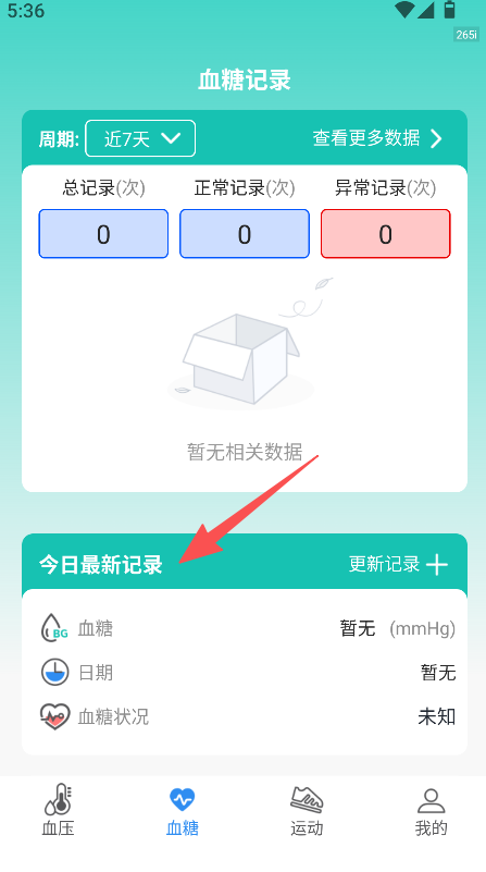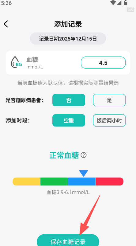 3、進入添加記錄頁面,填寫數據后保存血糖記錄。