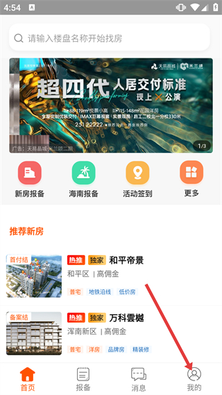 1、進(jìn)入房產(chǎn)軟件首頁(yè),可使用【新房報(bào)備】【活動(dòng)簽到】等功能,點(diǎn)擊底部【我的】按鈕,進(jìn)入個(gè)人中心頁(yè)面準(zhǔn)備后續(xù)操作。