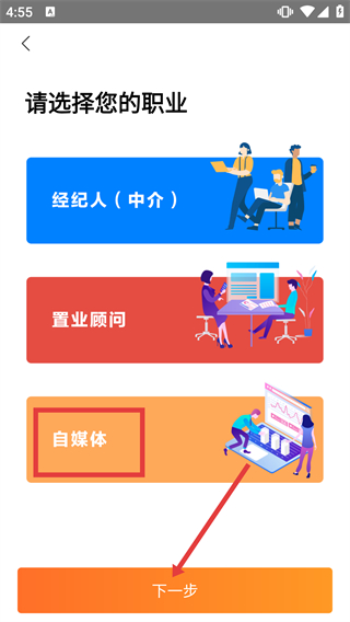 3、進(jìn)入注冊(cè)的職業(yè)選擇頁(yè)面,選中【自媒體】職業(yè)選項(xiàng)后,點(diǎn)擊底部【下一步】按鈕,進(jìn)入信息填寫(xiě)界面。