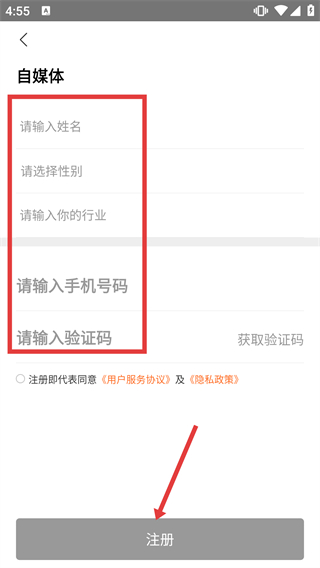 4、在【自媒體】注冊(cè)信息頁(yè),填寫(xiě)【姓名】【性別】等信息并獲取驗(yàn)證碼,勾選協(xié)議后點(diǎn)擊【注冊(cè)】完成賬號(hào)注冊(cè)。