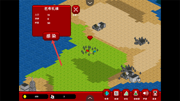 1、在區(qū)域界面(如巴布札維)點(diǎn)擊【感染】進(jìn)入關(guān)卡,查看區(qū)域人口、控制率等數(shù)據(jù),準(zhǔn)備展開(kāi)感染。