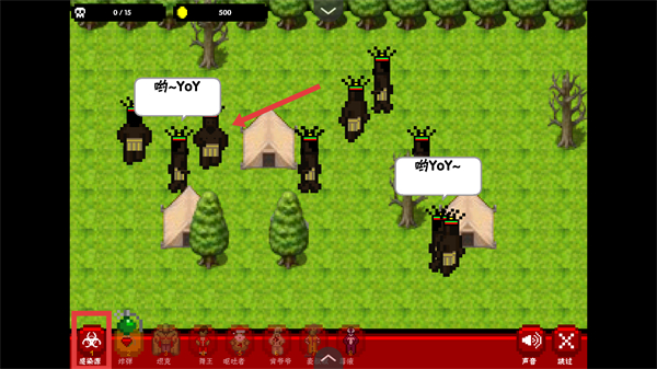 2、進(jìn)入關(guān)卡后,選擇方框內(nèi)的【感染源】,將其放在箭頭所指人群里,釋放病毒進(jìn)行感染。