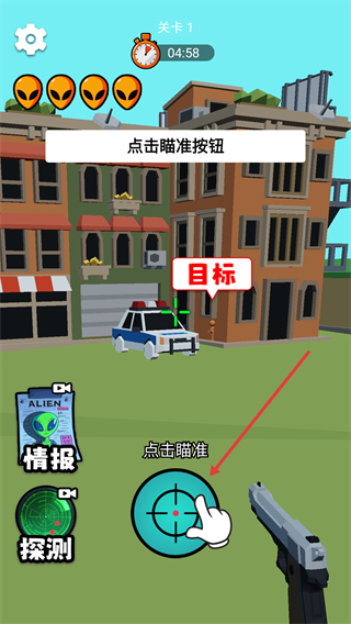 2、進(jìn)入【關(guān)卡1】后,根據(jù)提示點(diǎn)擊【瞄準(zhǔn)】按鈕,可鎖定標(biāo)注“目標(biāo)”的對象,為射擊做準(zhǔn)備。