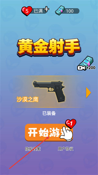 1、在【黃金射手】主界面,確認(rèn)已裝備【沙漠之鷹】后,點(diǎn)擊【開始游戲】(消耗1點(diǎn)愛心),即可進(jìn)入關(guān)卡。