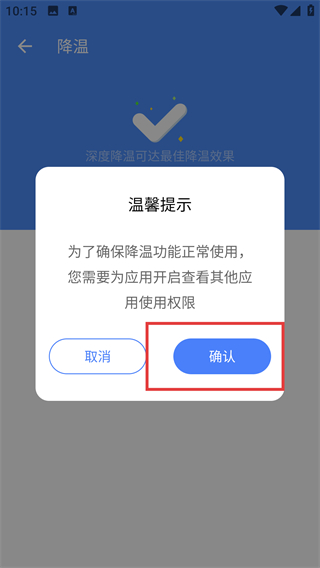 3、觸發(fā)深度降溫后會(huì)彈出權(quán)限提示,點(diǎn)擊【確認(rèn)】按鈕開啟對(duì)應(yīng)權(quán)限,就能讓降溫功能正常運(yùn)行啦。
