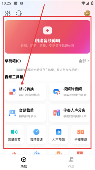 1、在功能頁面找到【格式轉換】工具并點擊,就能進入音頻格式轉換的文件選擇界面啦。