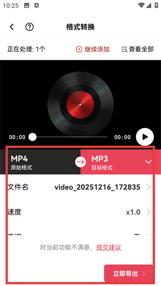 3、在格式轉換頁選擇原始格式和目標格式(如【MP4】轉【MP3】),設置好后點擊【立即導出】就能開始轉換啦。