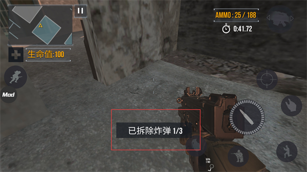 4、任務(wù)階段需完成拆彈目標(biāo),看到【已拆除炸彈-1/3】提示后,繼續(xù)推進以達成全部拆彈任務(wù),同時維持生命狀態(tài)。