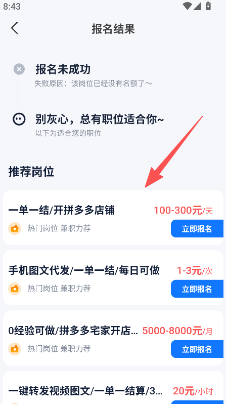 2、首頁呈現今日必做崗位,含多種類型及結算方式,報名未成功推送推薦崗位,完善兼職服務維度。