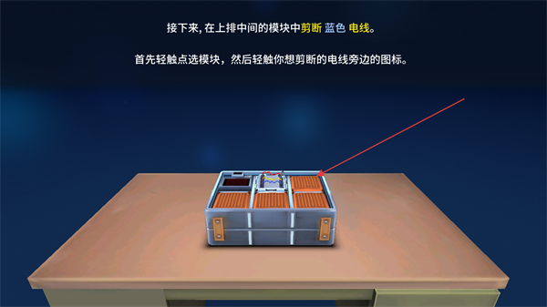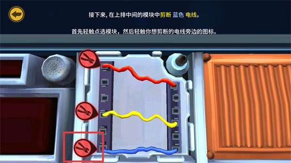 1、操作時先輕點上排中間模塊,再觸碰對應圖標,完成該模塊中【藍色】電線的剪斷步驟。