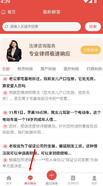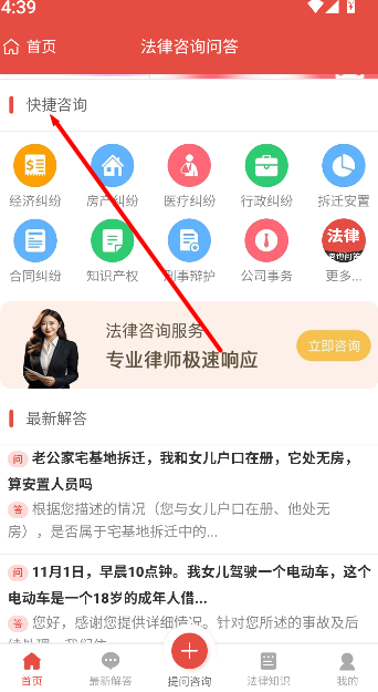 1、打開(kāi)《法律咨詢問(wèn)答》,進(jìn)入首頁(yè)后瀏覽頁(yè)面布局,了解如何快速發(fā)起法律咨詢。