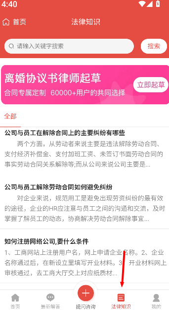 3、進(jìn)入“法律知識(shí)”板塊,查閱相關(guān)法律條文和案例內(nèi)容,獲取實(shí)用參考信息。