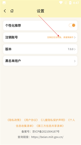 3、在設置頁面,選擇【注銷賬號】選項,觸發賬號注銷的確認彈窗。