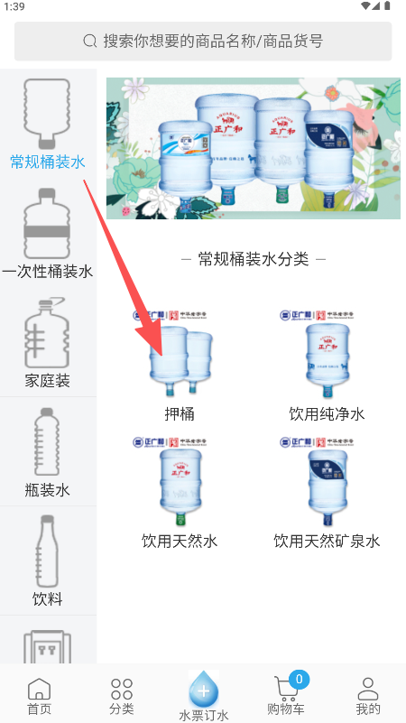 2、在“常規桶裝水分類”中,選擇“押桶”等所需水品類。