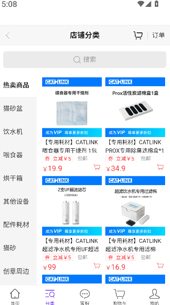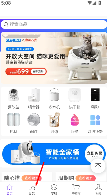1、打開(kāi)《CATLINK》,進(jìn)入首頁(yè)后瀏覽各類商品分類,快速找到感興趣的寵物用品。