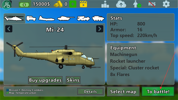 2、選擇【Mi-24】載具,查看其等屬性,點擊【To-battle!】進入戰(zhàn)斗。