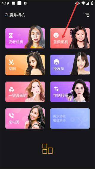1、打開【魔秀相機】界面,找到【童顏相機】功能選項并點擊,即可進(jìn)入該功能的操作流程。