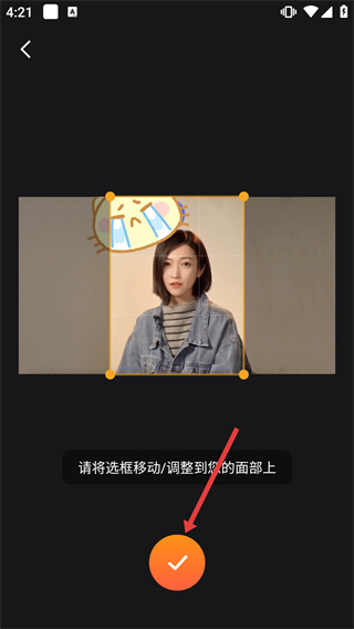2、進(jìn)入功能頁后,按提示將選框移動-調(diào)整到面部區(qū)域,確認(rèn)位置后點擊下方的【√】按鈕繼續(xù)。