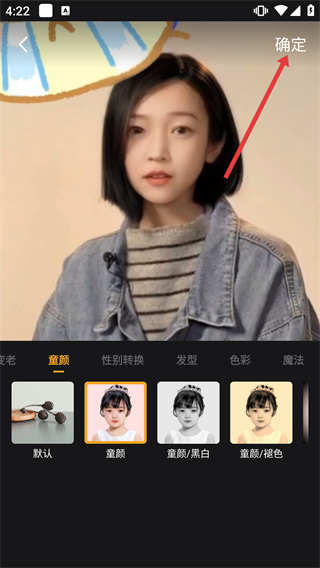 3、在效果選擇界面選定【童顏】等樣式后,點擊右上角的【確定】按鈕,應(yīng)用該特效效果。