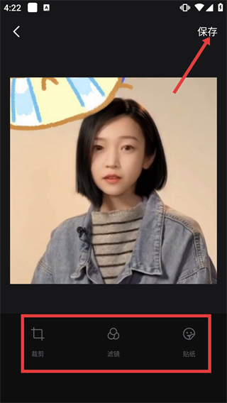 4、特效應(yīng)用完成后,可使用【裁剪】-【濾鏡】-【貼紙】功能優(yōu)化,調(diào)整后點擊右上角【保存】即可導(dǎo)出。