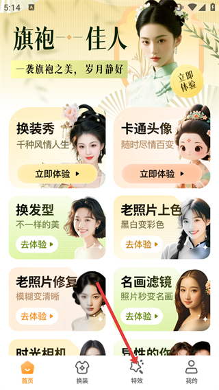 1、在【旗袍--佳人】界面,點(diǎn)擊底部的【特效】按鈕,進(jìn)入特效功能頁(yè),可查看【換裝秀】-【卡通頭像】等多種美化功能。