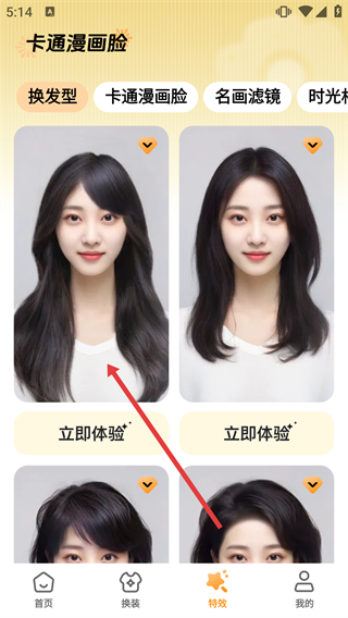 2、進(jìn)入特效的【換發(fā)型】板塊,瀏覽展示的發(fā)型樣式,選擇心儀款式后點(diǎn)擊對(duì)應(yīng)的【立即體驗(yàn)】按鈕。